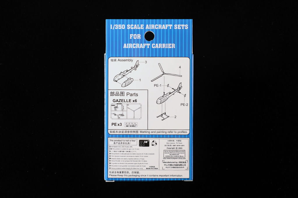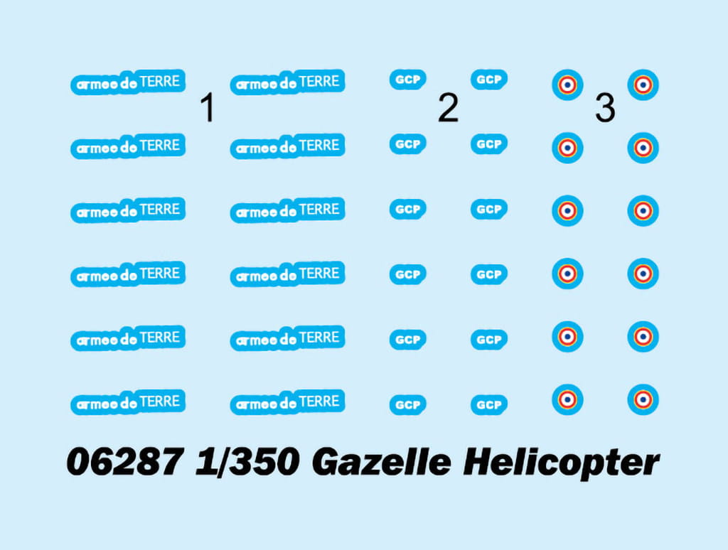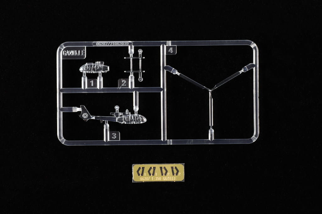 Trumpeter 06287 to zestaw zawierający sześć modeli lekkiego śmigłowca Gazelle w skali 1:350. Ta znana konstrukcja francuskiej firmy Aérospatiale była szeroko wykorzystywana do zadań rozpoznawczych, łącznikowych oraz wsparcia bojowego. Miniatury świetnie nadają się do uzupełnienia pokładu okrętu, fregaty lub nowoczesnego okrętu desantowego w tej samej skali.