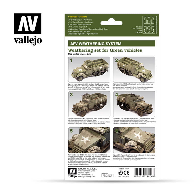 Zestaw do weatheringu pojazdów w zielonych kolorach. Zawiera 7 buteleczek (3 farby po 8 ml, 1 pigment, 1 pigment binder, 2 washe) Załączona instrukcja krok po kroku.