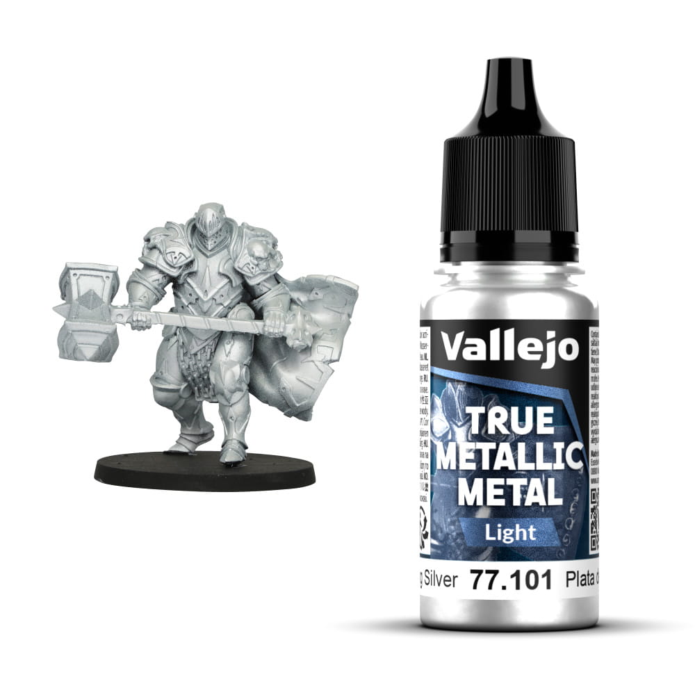 Vallejo 77101 – Sterling Silver to akrylowa farba metaliczna typu LIGHT z serii True Metallic Metal, zaprojektowana jako jasny, rozświetlający odcień srebra. Idealnie nadaje się do rozjaśnień na zbrojach, broni, elementach mechanicznych i dekoracyjnych detalach, dodając im mocnych refleksów i wyrazistych krawędzi przy zachowaniu naturalnego blasku metalu.