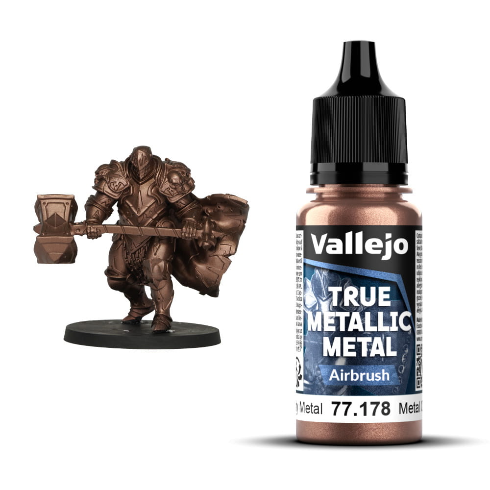 Vallejo 77178 – Rusty Metal Airbrush to metaliczna farba akrylowa z serii True Metallic Metal, opracowana specjalnie do aplikacji aerografem. Jej ciepły, rdzawo-brązowy odcień z subtelnym metalicznym połyskiem idealnie oddaje wygląd starego, utlenionego żelaza, zbroi dotkniętej wiekiem lub elementów technicznych noszących ślady eksploatacji.