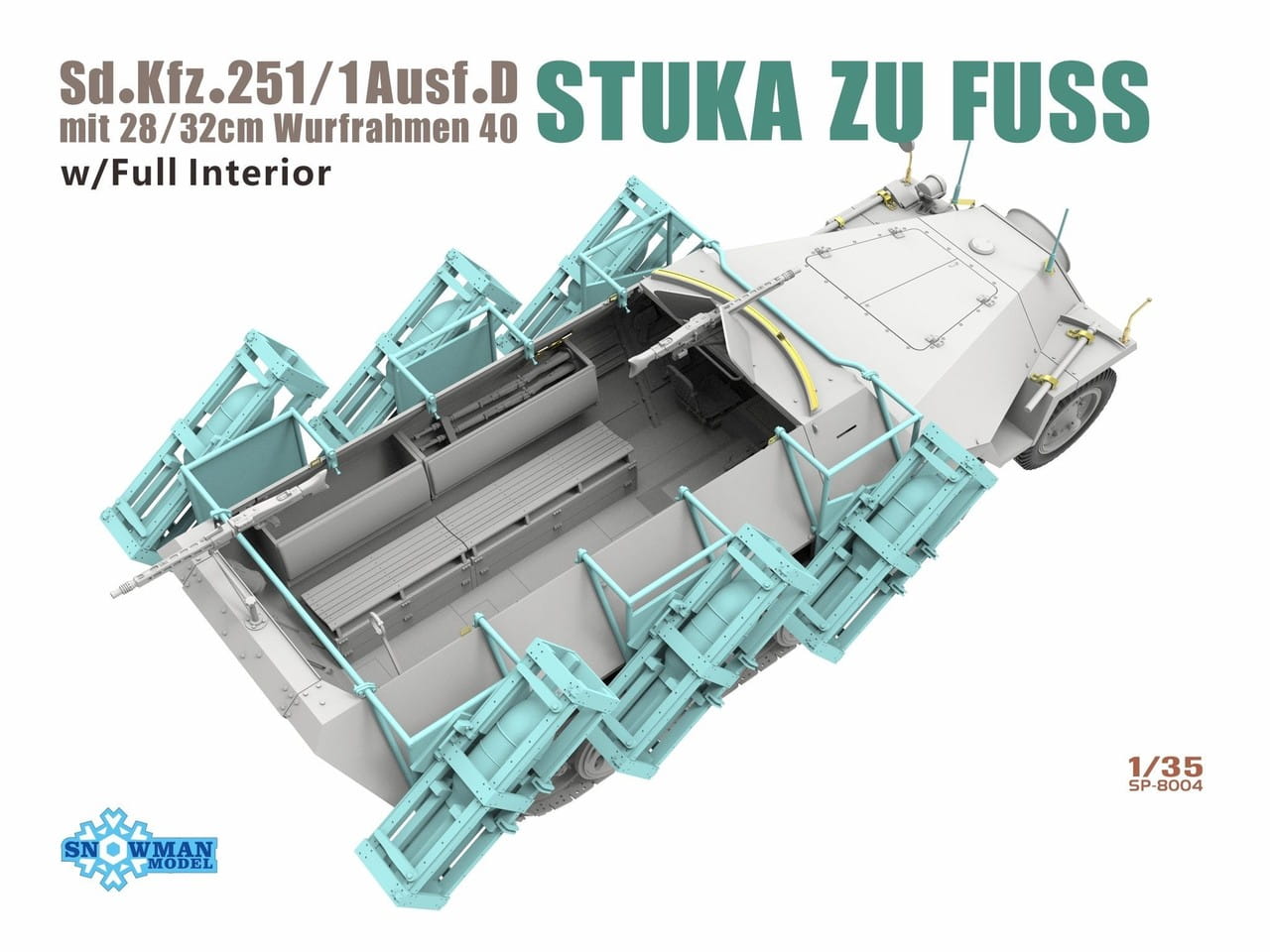 Sd.Kfz. 251/1 Ausf. D w wersji Stuka zu Fuß był niemieckim półgąsienicowym transporterem opancerzonym przystosowanym do przenoszenia ciężkich rakiet niekierowanych kal. 28 cm i 32 cm, montowanych w ramach Wurfrahmen 40. Pojazd ten był używany jako mobilna platforma wsparcia ogniowego, szczególnie na froncie wschodnim. Model firmy Vespid Models w skali 1:35 pozwala na bardzo szczegółowe odwzorowanie tej charakterystycznej konfiguracji.